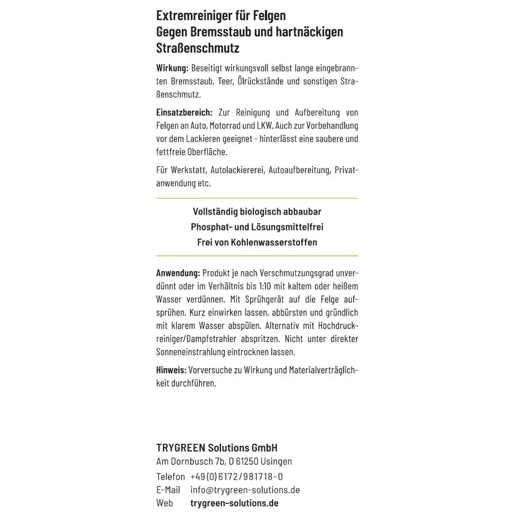 - Anwendung: Mit einem Sprühgerät gleichmäßig auf die Felge aufsprühen. Kurz einwirken lassen und bei Bedarf abbürsten.