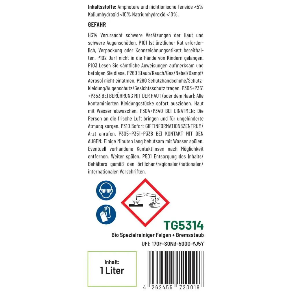 Unser SPEZIALREINIGER FELGEN + BREMSSTAUB ist ein hochwirksamer Felgenreiniger, der speziell für die intensive Reinigung von Felgen an Auto, LKW und Motorrad entwickelt wurde. Er ist ein besonders leistungsstarker Bremsstaub-Entferner und löst darüber hinaus auch Teer, Ölrückstände, Schmierstoffe und andere hartnäckige Ablagerungen. Dieser Felgenreiniger ist hochkonzentriert und kann je nach Felgentyp und Verschmutzungsgrad optimal verdünnt werden.