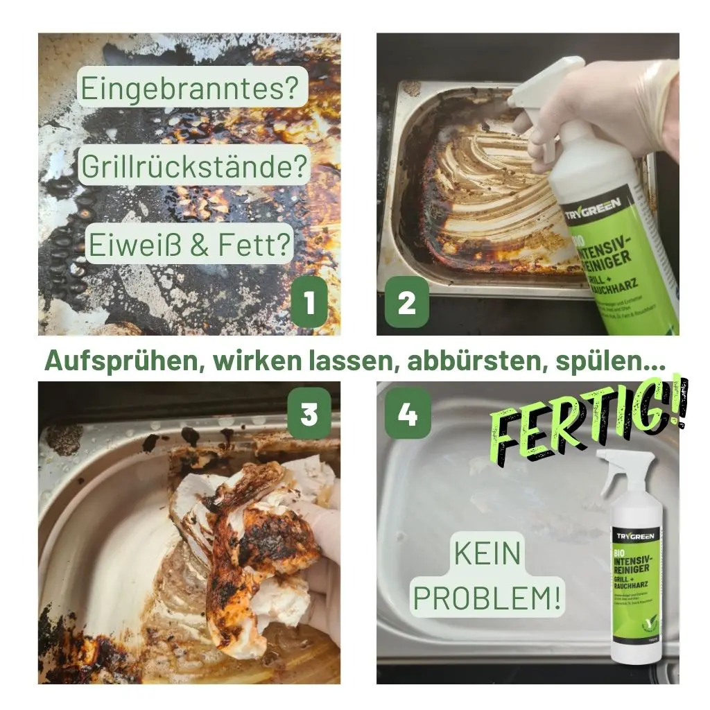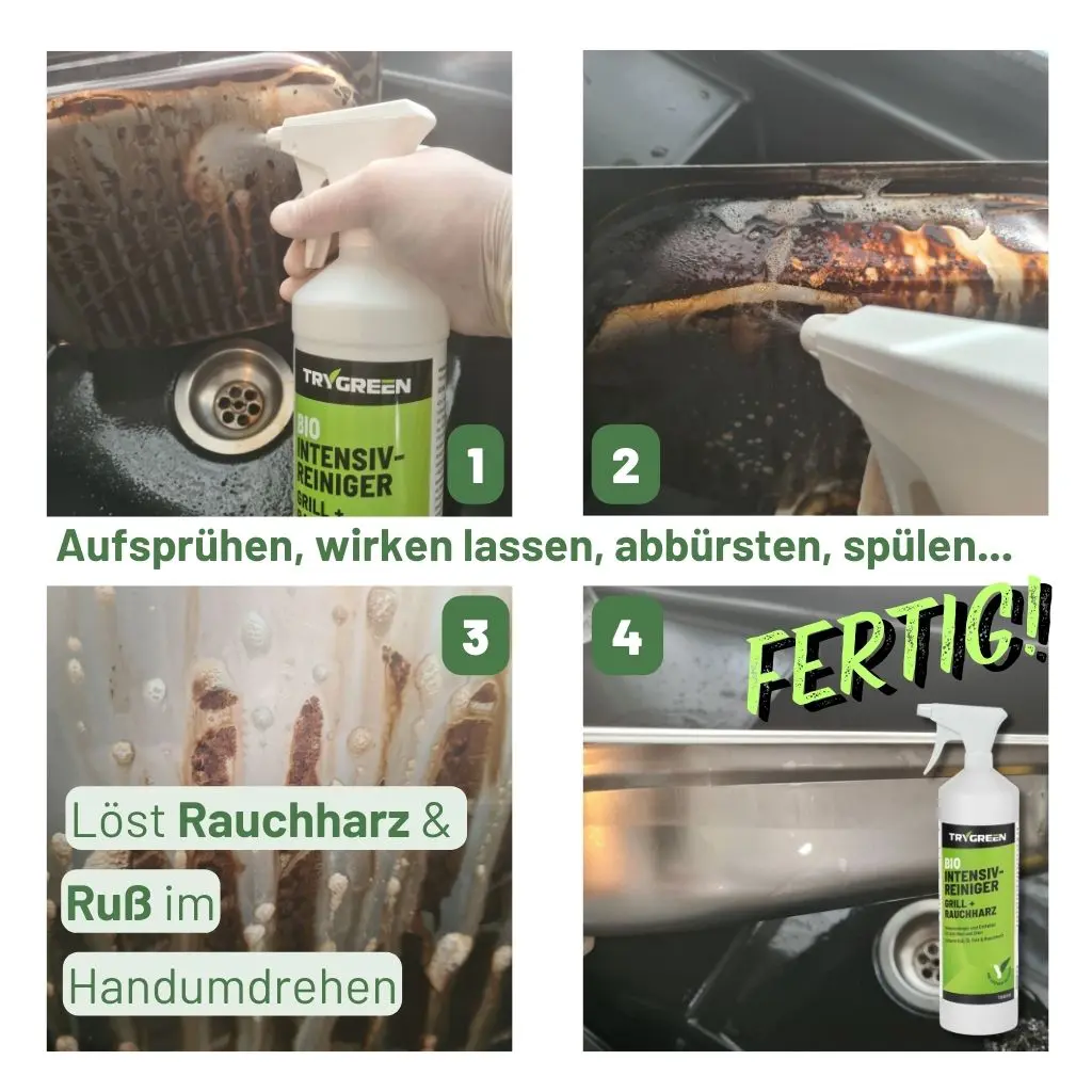 - Einwirken lassen: Einige Minuten einwirken lassen, um hartnäckige Fett- und Rußrückstände zu lösen.