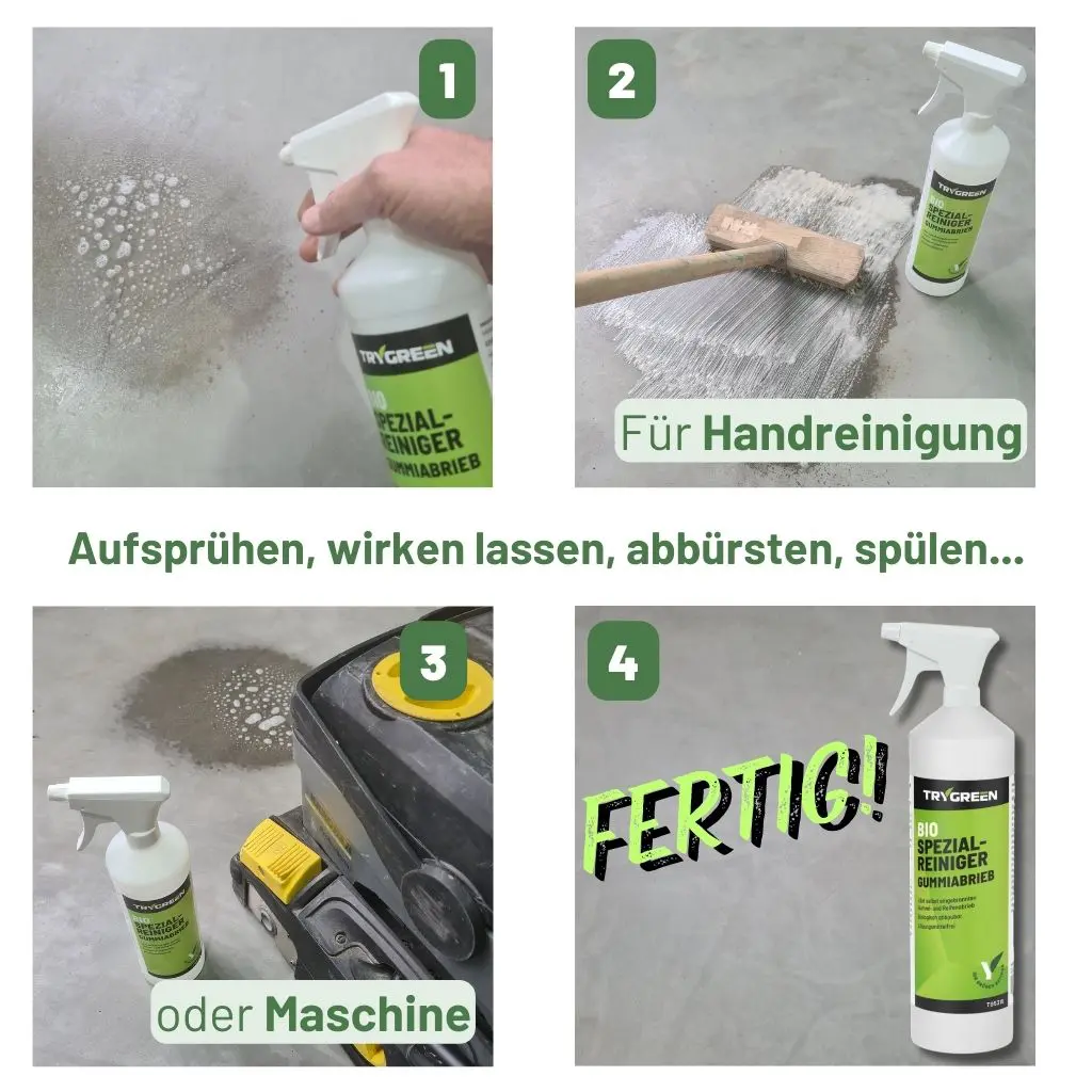 • Einfache Anwendung: Gummiabriebentferner für die manuelle Reinigung mit Bürste oder mit Reinigungsmaschinen.