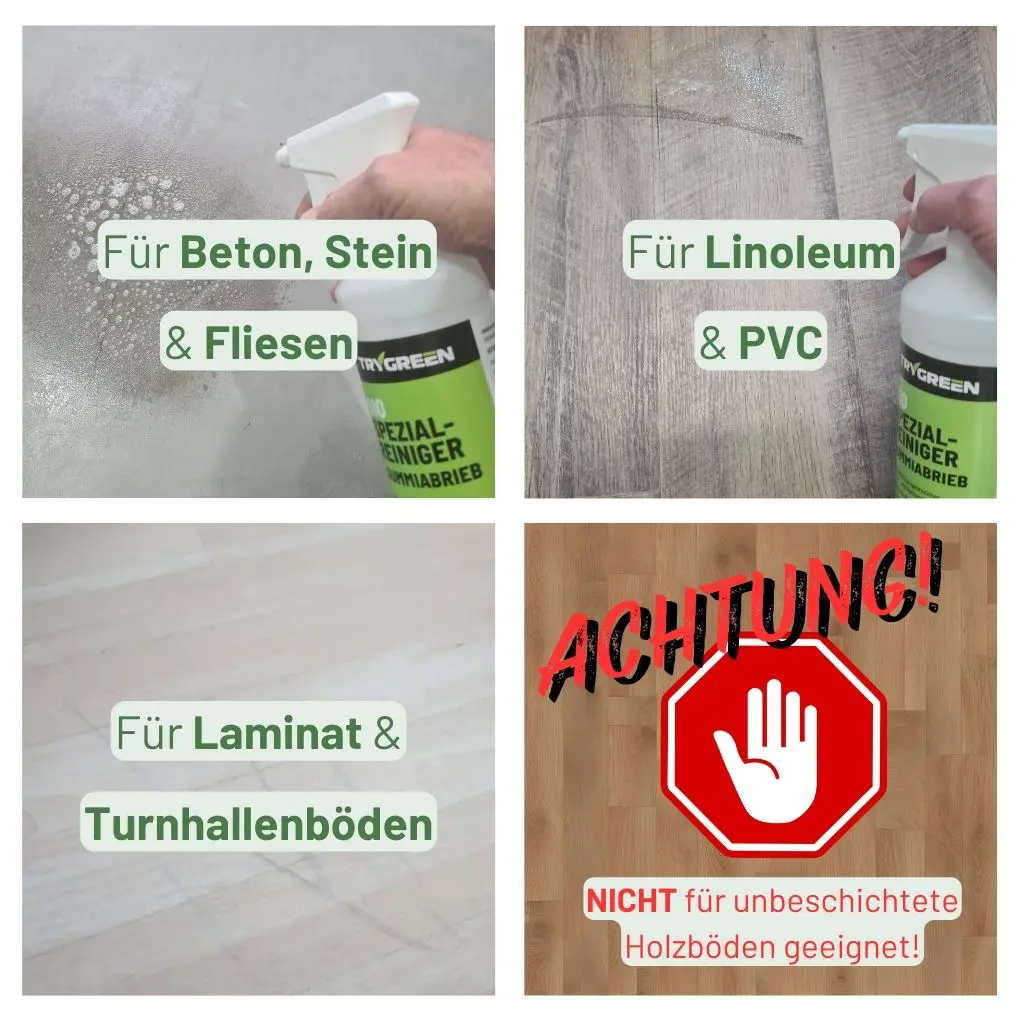 Normale Allzweck- oder Bodenreiniger lösen Gummiabrieb nicht. Der Spezialreiniger wurde speziell dafür entwickelt, um eingebrannte Reifenspuren und Schuhabrieb effektiv zu lösen, ohne den Boden zu beschädigen.